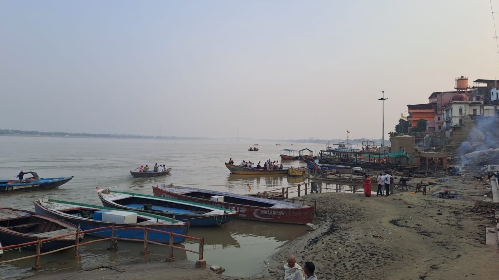 le gange – les rives embrumées au loin – les petites barques et bateaux colorés, rouillés par le temps – quelques indiens qui se baignent dans l’eau terreuse